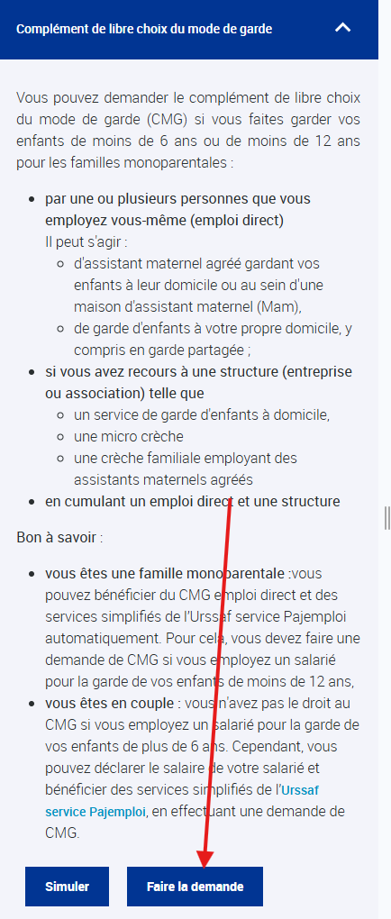 Si vous avez un compte CAF, connectez-vous et faites la demande de prestation pour le CMG (« Complément de libre choix du mode de garde ») en choisissant emploi direct (Vous êtes employeur direct d’une assistante maternelle). Si vous n'avez pas de compte, crée-le.